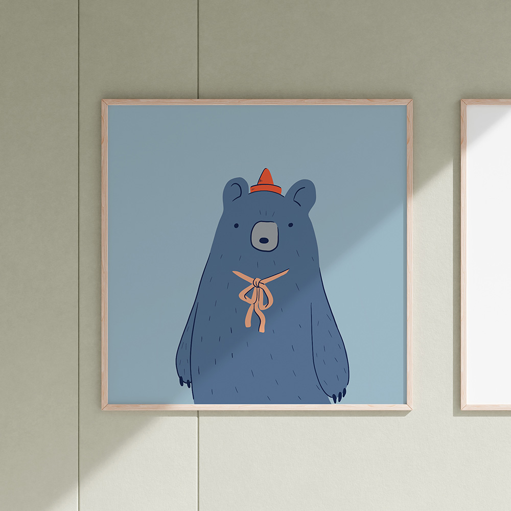 Björnvår är en digital illustration av Frida Rosvall och ingår i en serie verk som porträtterar djur i olika årstider. Med mjuka former och ett lekfullt uttryck skildrar verket ett fantasifullt djurporträtt som bjuder in till glädje, igenkänning och berättande – och passar lika bra i barnrummet som i mysmiljön.