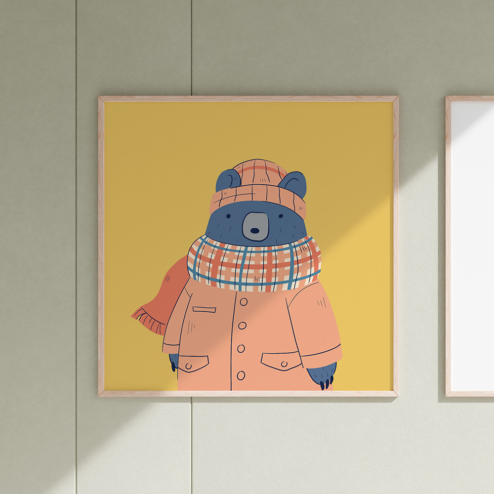Björnvinter är en digital illustration av Frida Rosvall och ingår i en serie verk som porträtterar djur i olika årstider. Med mjuka former och ett lekfullt uttryck skildrar verket ett fantasifullt djurporträtt som bjuder in till glädje, igenkänning och berättande – och passar lika bra i barnrummet som i mysmiljön.
