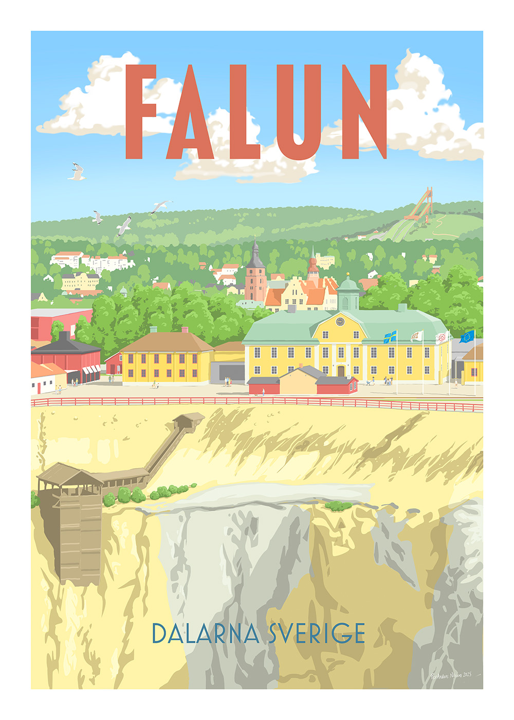 Grafisk, handritad poster över Falun, Dalarna, Sverige.