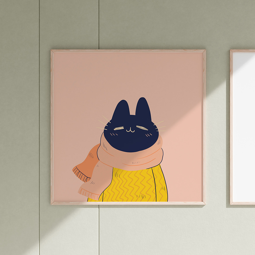 Katthöst är en digital illustration av Frida Rosvall och ingår i en serie verk som porträtterar djur i olika årstider. Med mjuka former och ett lekfullt uttryck skildrar verket ett fantasifullt djurporträtt som bjuder in till glädje, igenkänning och berättande – och passar lika bra i barnrummet som i mysmiljön.