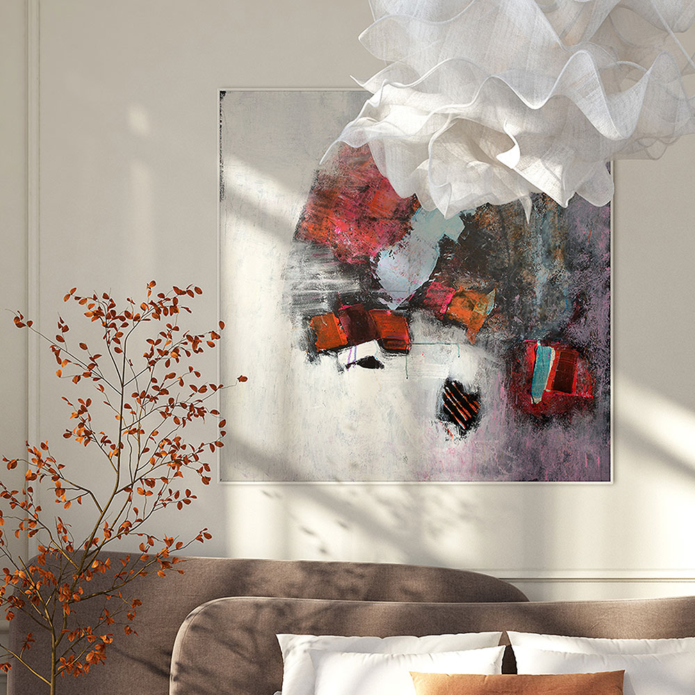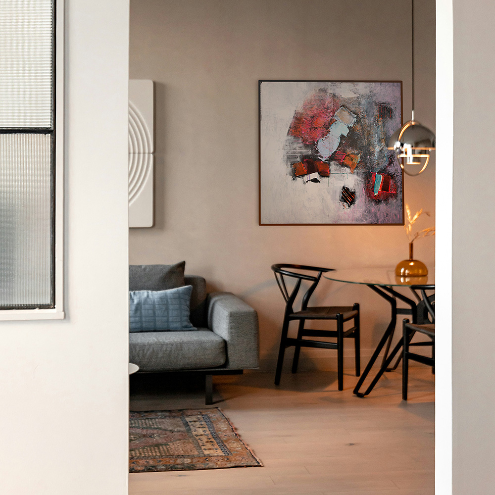My doll är uppbyggd i lager av akryl där färg och form långsamt får mötas. De dämpade tonerna skapar ett mjukt djup som ger bilden en eftertänksam karaktär. Ett konstverk som tillför rummet stillsam värme och lämnar plats för egen tolkning.