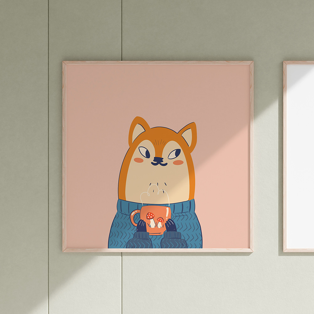 Rävhöst är en digital illustration av Frida Rosvall och ingår i en serie verk som porträtterar djur i olika årstider. Med mjuka former och ett lekfullt uttryck skildrar verket ett fantasifullt djurporträtt som bjuder in till glädje, igenkänning och berättande – och passar lika bra i barnrummet som i mysmiljön.